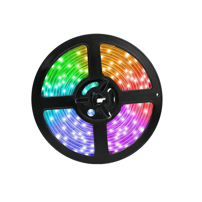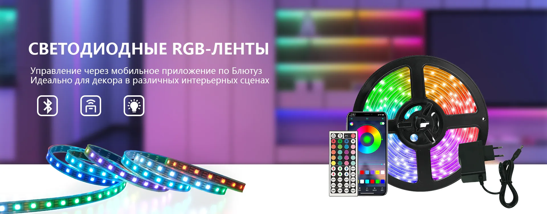 TZDD-06 Смарт-лента 30 м 12 светодиодов/м Светодиодная лента RGB с изменением цвета, управление через приложение и пульт ДУ 4848 RGB светодиодный чип Комплектация: 2 рулона по 15 м, плотность 12 светодиодов/м, степень защиты IP20 44-кнопочный пульт ДУ с управлением через Блютуз-приложение Адаптер 24V 1A евростандарт с двухжильным проводом Плата ПП: ширина 8.8мм Контроллер без соединительного кабеля
